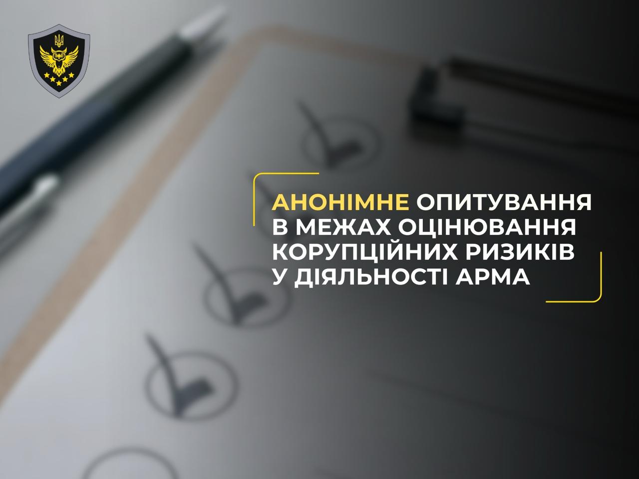 Участь в опитуванні є цілком анонімною. Персональні дані респондентів не збираються. Отримані відповіді будуть використані виключно в узагальненому вигляді під час підготовки заходів із мінімізації корупційних ризиків та удосконалення діяльності АРМА.