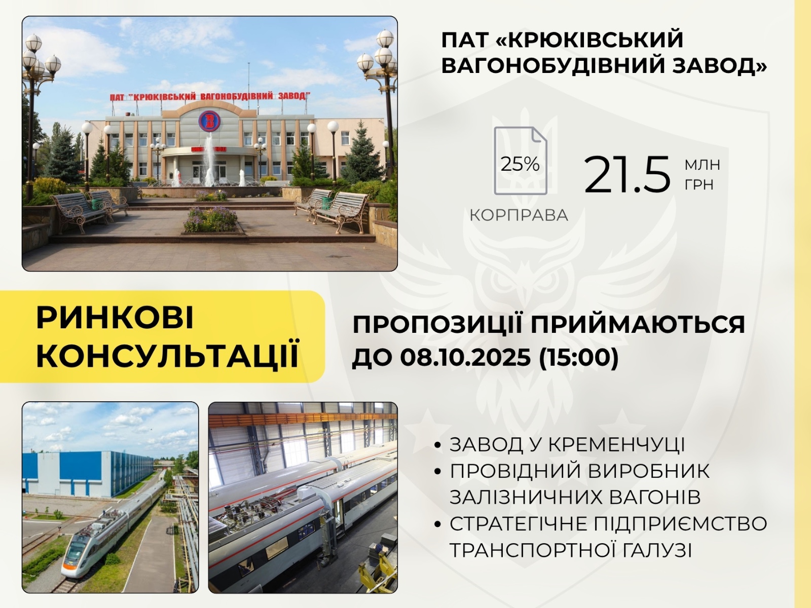 Агентство з розшуку та менеджменту активів (АРМА) відкрило прийом пропозицій щодо управління 25% статутного капіталу ПАТ «Крюківський вагонобудівний завод» – одного з найбільших і найстаріших машинобудівних підприємств України.