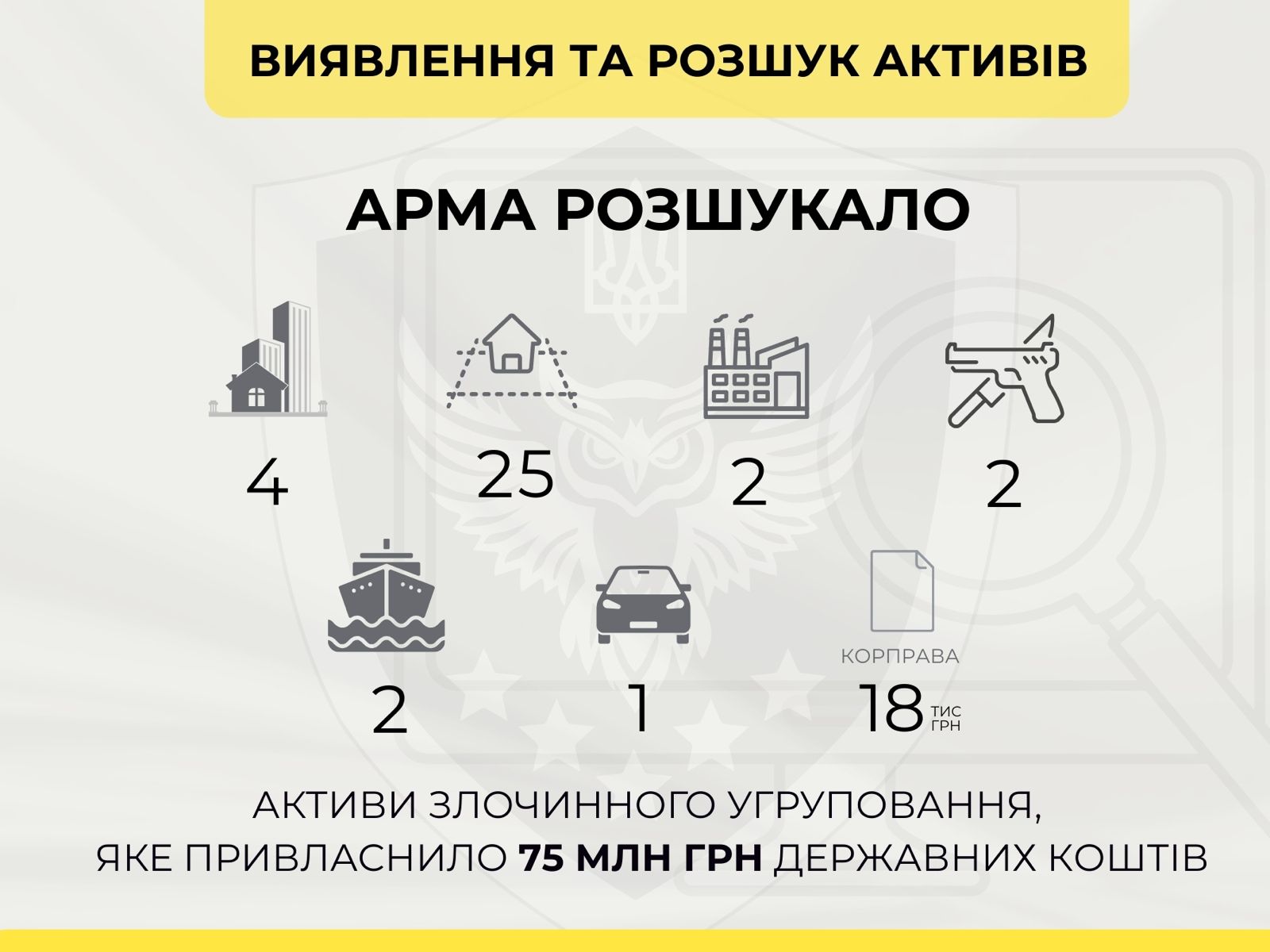 Працівники Департаменту виявлення, розшуку фінансових та інших активів АРМА провели комплексний аналіз інформації про підозрюваних і їхній майновий стан. У підсумку вдалося встановити й розшукати незаконно набуте майно, зокрема: